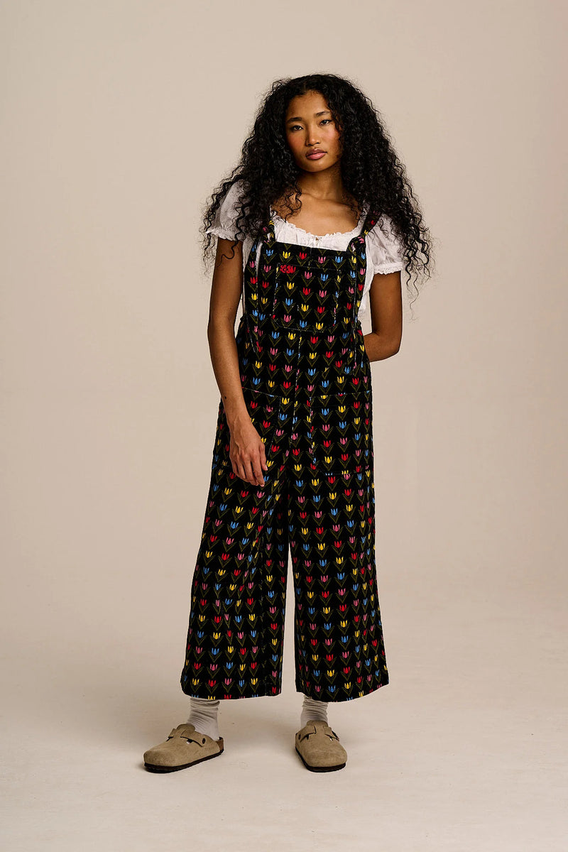 Jenny - Wide Leg Corduroy Dungarees in Black Tulip Print