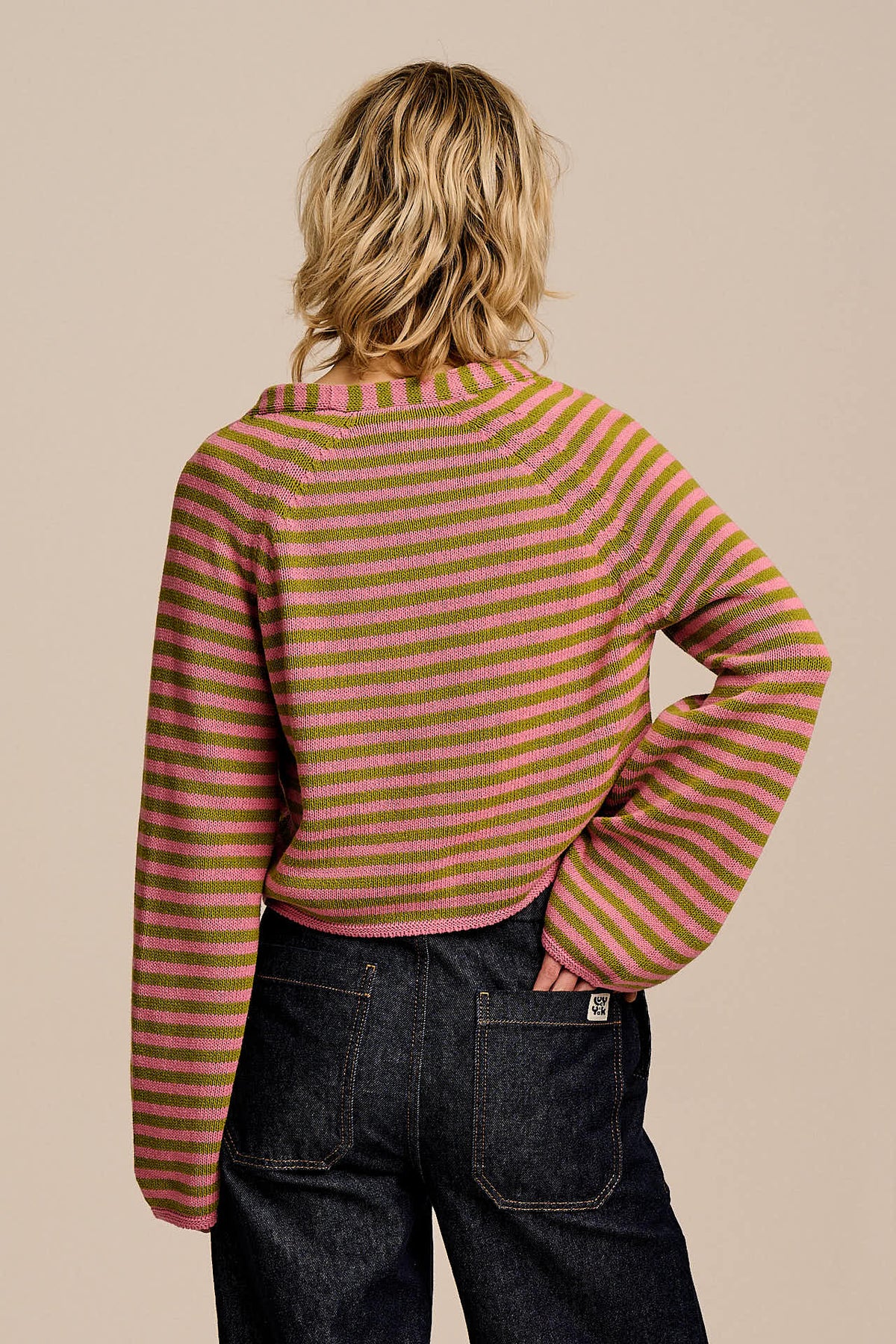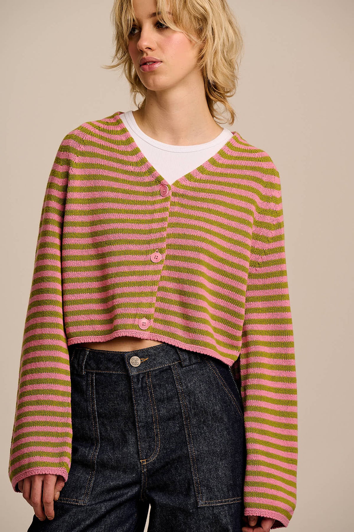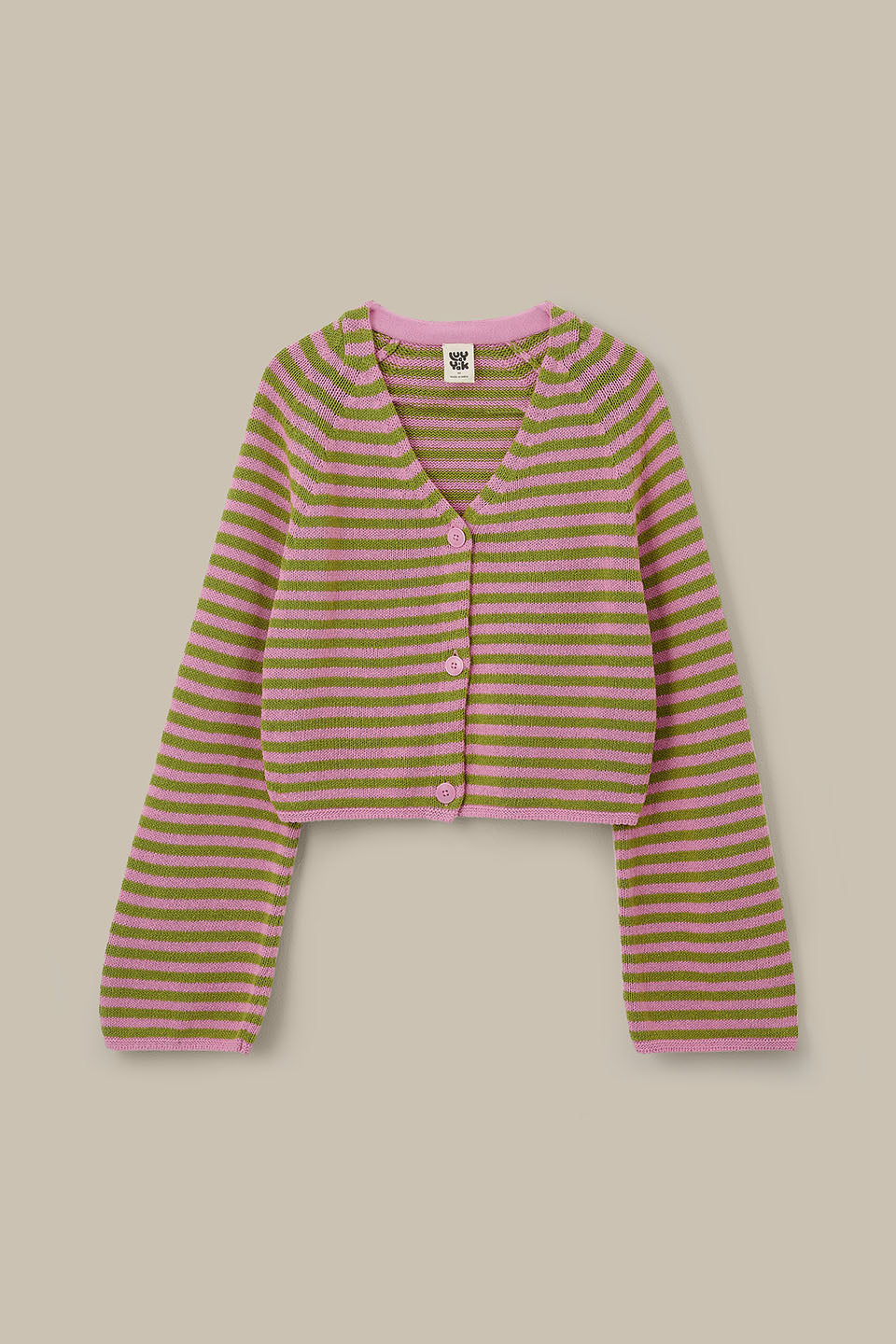 Robyn - V-Neck Cotton Cardigan in Green & Pink Stripe