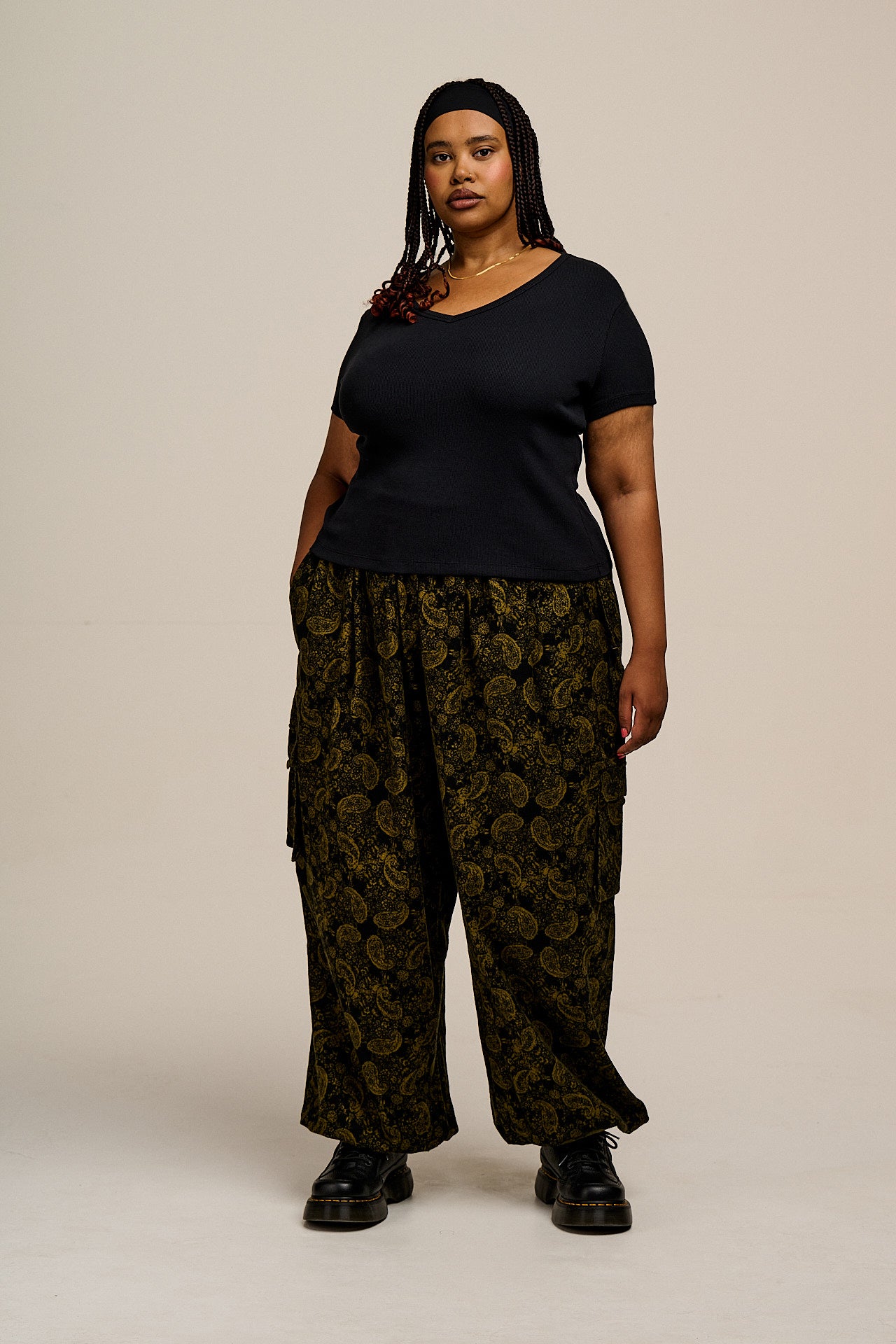 Ivy - Ribbed Cotton V Neck T-Shirt in Black