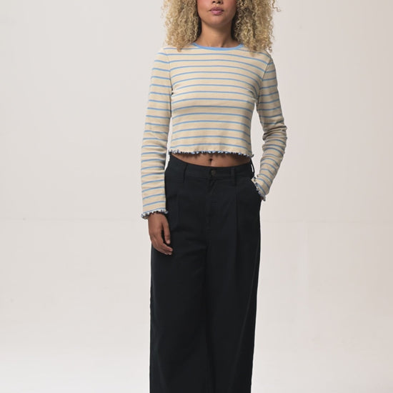 Hansel - Long Sleeve Cotton Crop Top in Blue & Ecru Stripe