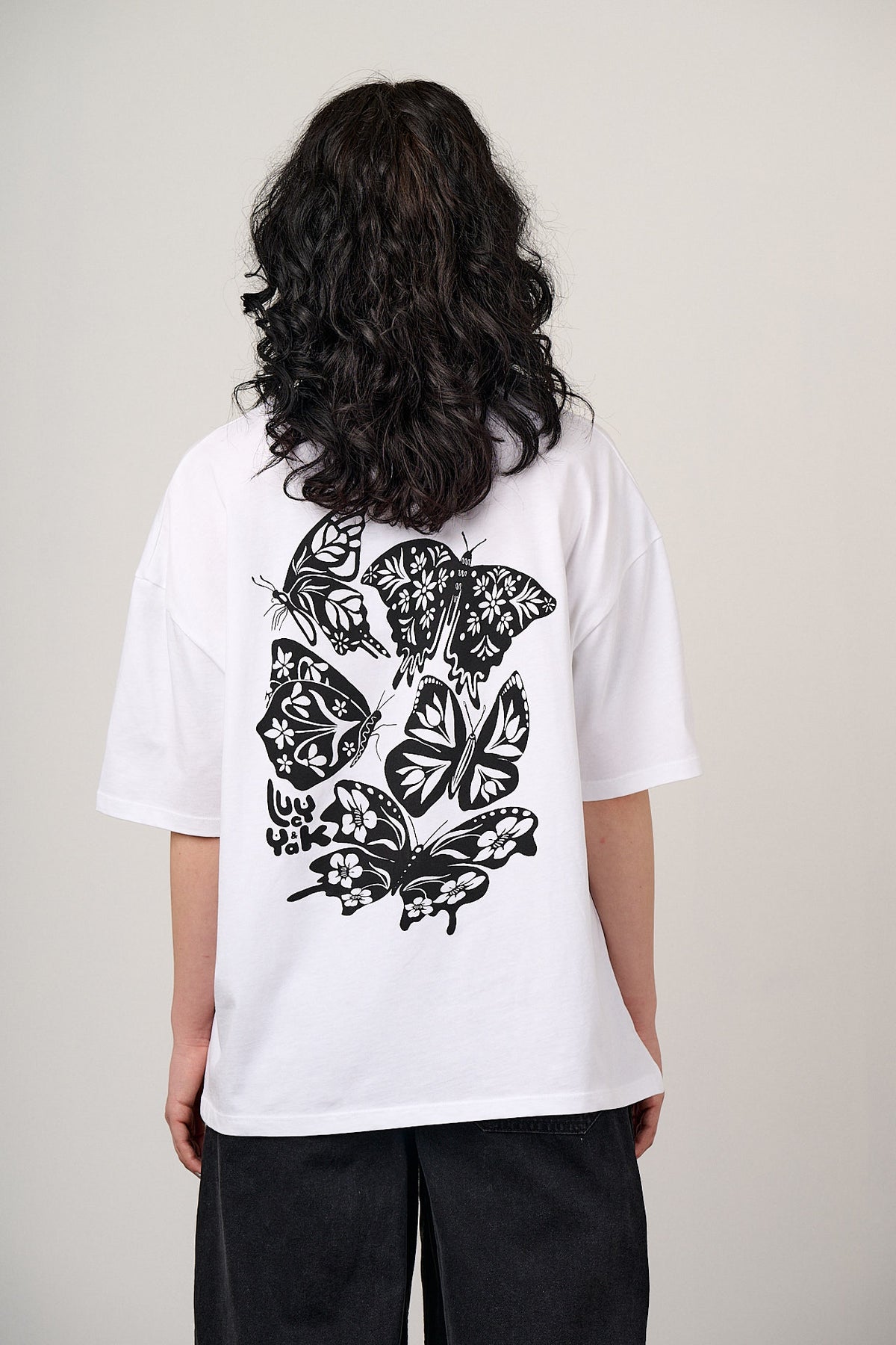 Benny - Oversized Cotton T-Shirt in White with Butterfly Print