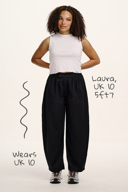 I have been waiting for the velvet barrel leg to be in stock for weeks. When they came back, I ordered a 12 & 14 to ensure I can always have them in my life (weight fluctuations & other issues means I can struggle with sizing). I, therefore, paid £150 for two pairs of trousers. Positives - the material is warm, pockets deep & are velvet inside. Zip, button & metal clasps are secure. Elasticated back gives comfort throughout day though as my body is long the rise is a little short. Price point is a tad high for the quality of material (thickness) itself but I choose to gloss over this as I am yet to find velvet barrel leg trousers (like these) anywhere. Now time for the negative - something which is comical & frustrating in equal measure. The bobbling on the inside of the trousers. I cannot understand how or why but every step I take, every move I make - I am leaving behind a trail of fluff. Little green, fuzzy clouds mark the routes I travel. My new L&Y trousers - the Hansel & Gretel of clothing - washing hasn't improved the issue but the washing basket, machine & line certainly display the trousers signature calling card. The vacuum cleaner has never been out this much and I quickly learned to remove the troublesome trousers before hoovering or the activity becomes a never ending story. I am loathe to return, especially as I have washed & worn every day since each pair arrived but we will see what happens as time moves on. I'm certainly not about to commit any crimes in a velvet barrel leg - 'The Fuzz' would be onto me......and literally all over me!