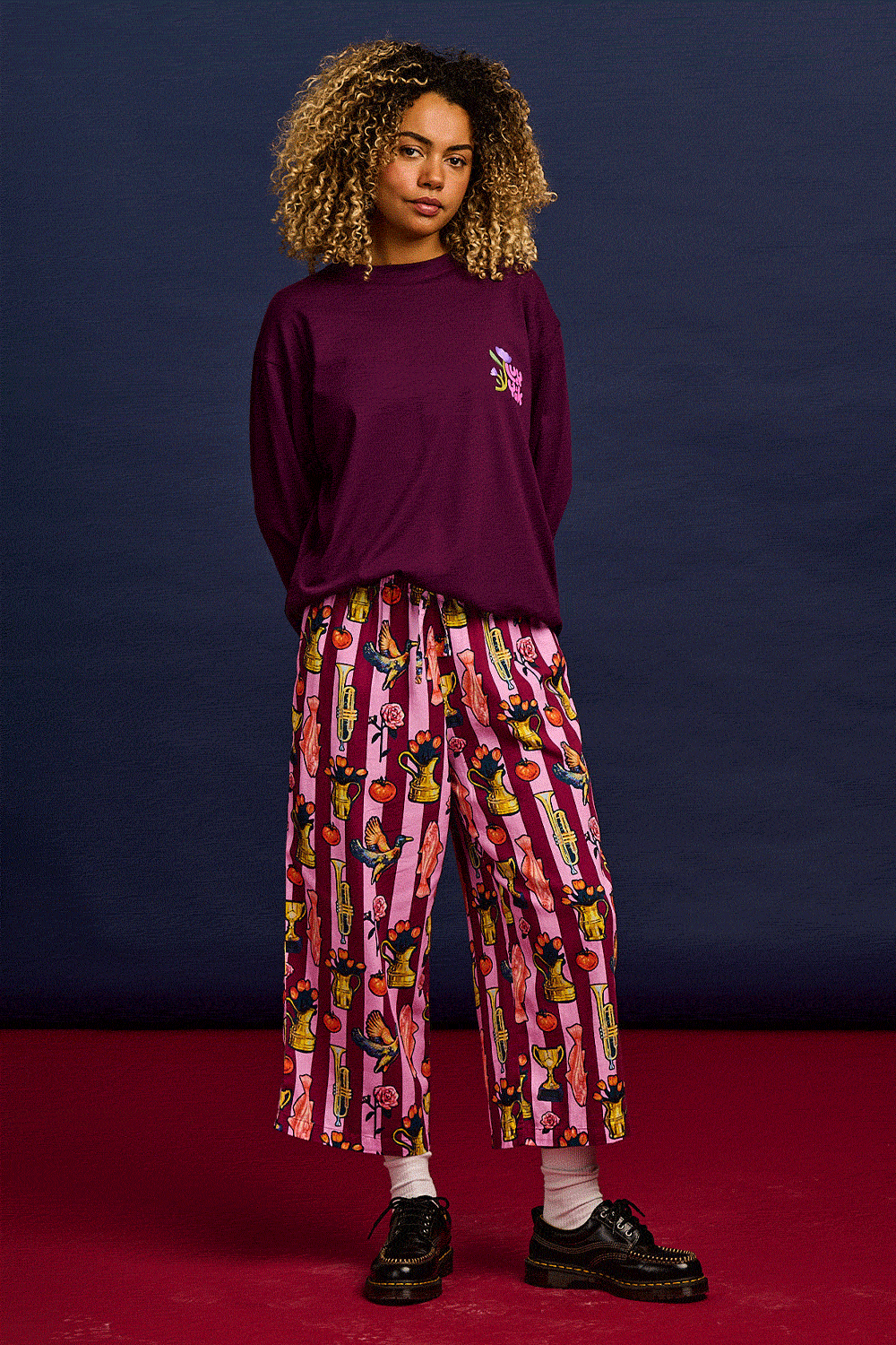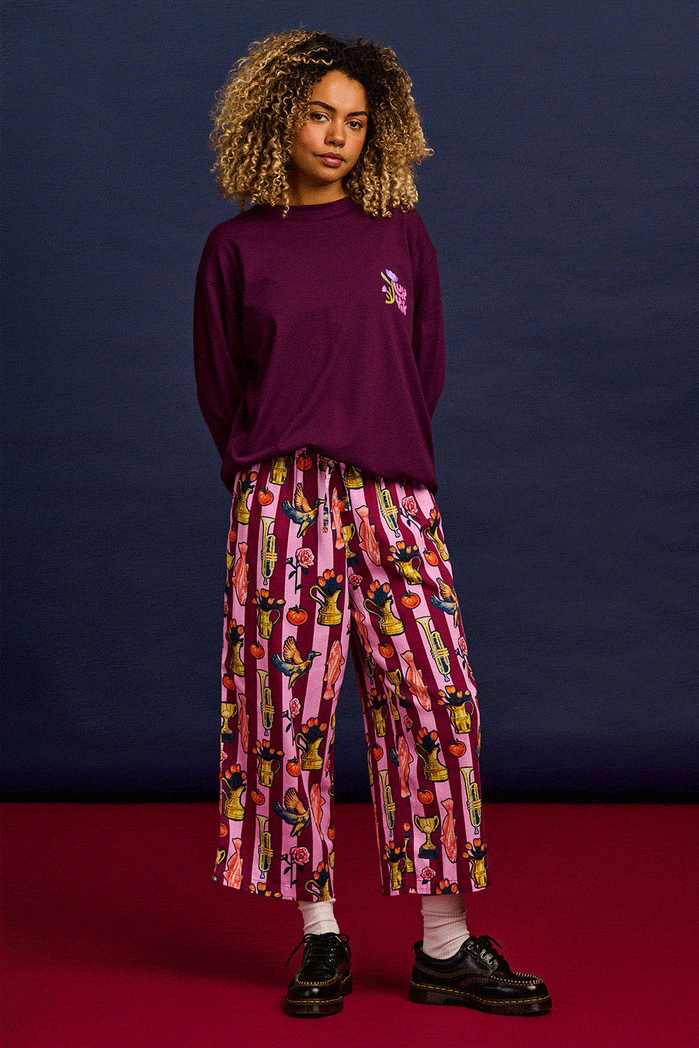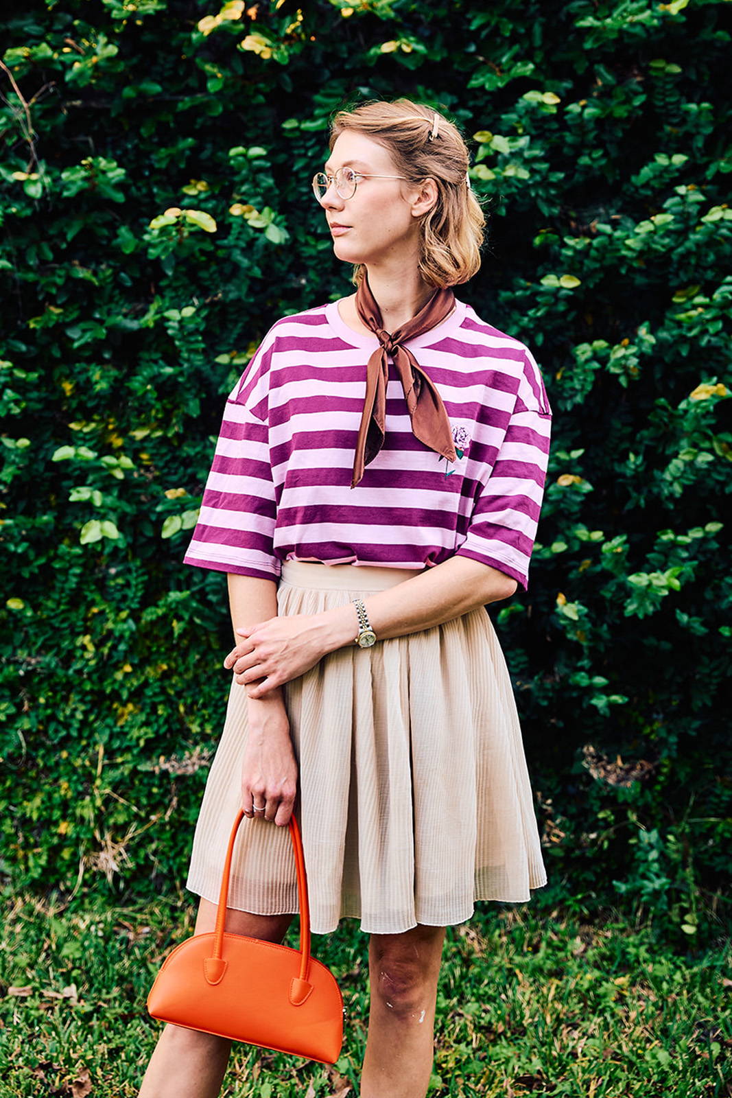 The collection’s signature stripes bring this world vividly to life. A soft light pink balances a deep mulberry, capturing the light and the dark of the autumn season. ‘I love how these two colors interact,’ Emily shares. ‘The combination feels playful and cosy, carrying the subtle shift of seasons where everything glows a little warmer.’ The pink adds freshness and lightness; the mulberry lends richness and grounding depth.