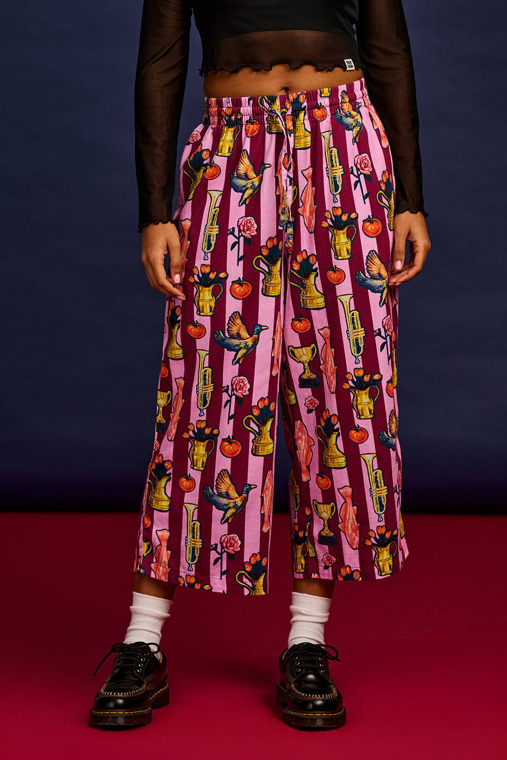 With this collection, Emily Furr reminds us that art can live in the small, glowing details of daily life: in the shimmer of brass, the blush of a tomato, or the gentle rhythm of pink and mulberry stripes. It’s a world that feels her own: familiar and cosy, yet delightfully strange.