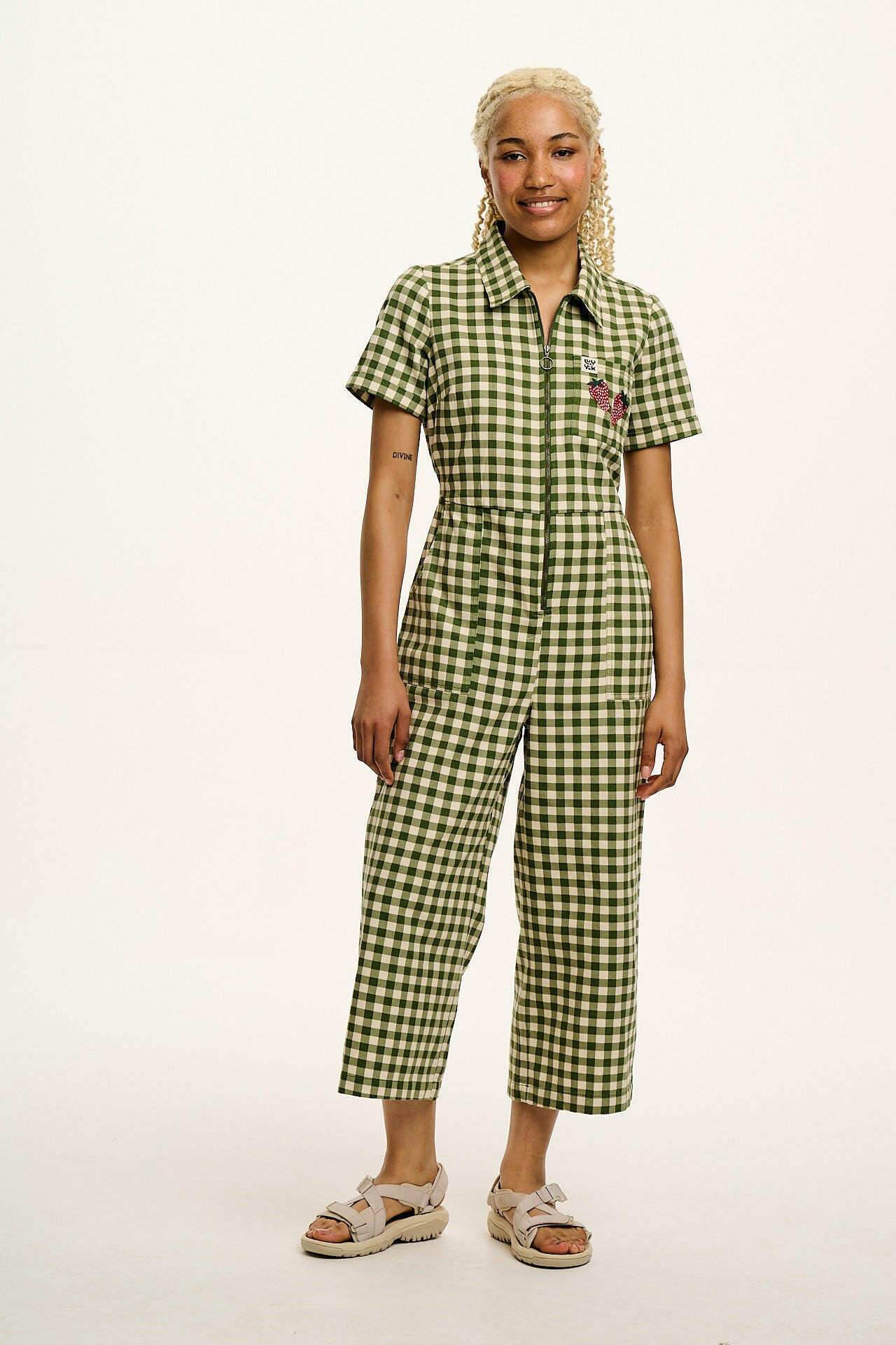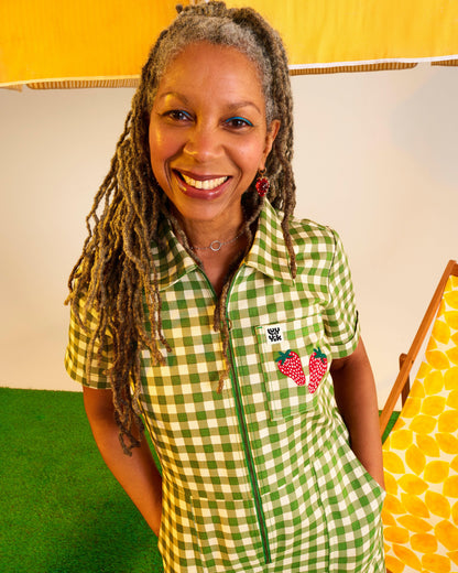 Ragan - Cotton Jumpsuit in Green Gingham with Strawberry Embroidery