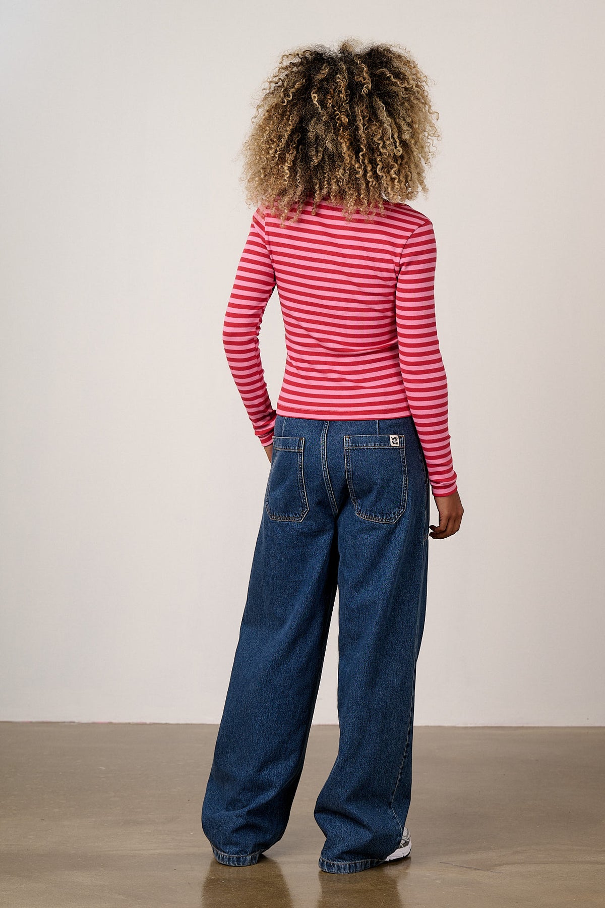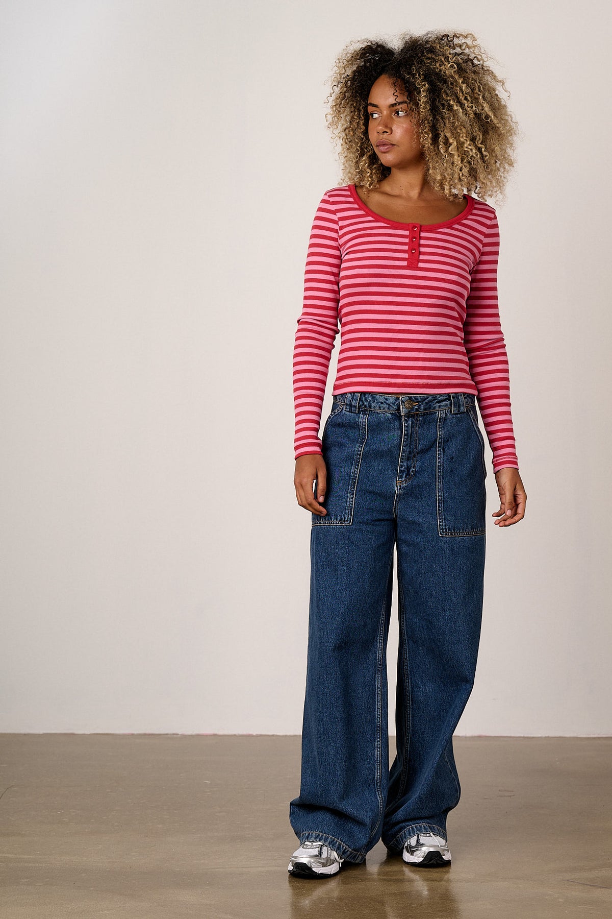 Lana - Cotton Long Sleeve Rib Top in Pink & Red Stripe