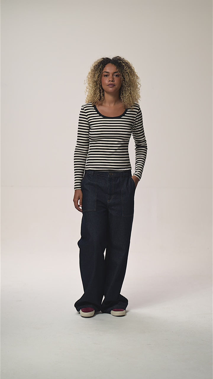 Remy - Ribbed Cotton Scoop Neck Long Sleeve T-Shirt in Black & White Stripe