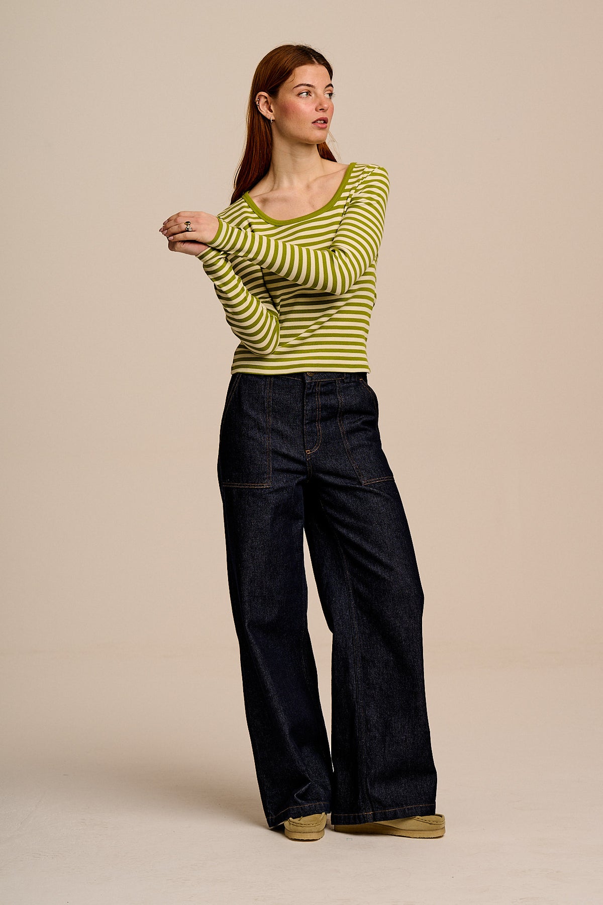 Remy - Ribbed Cotton Scoop Neck Long Sleeve Top in Green & Ecru Stripe