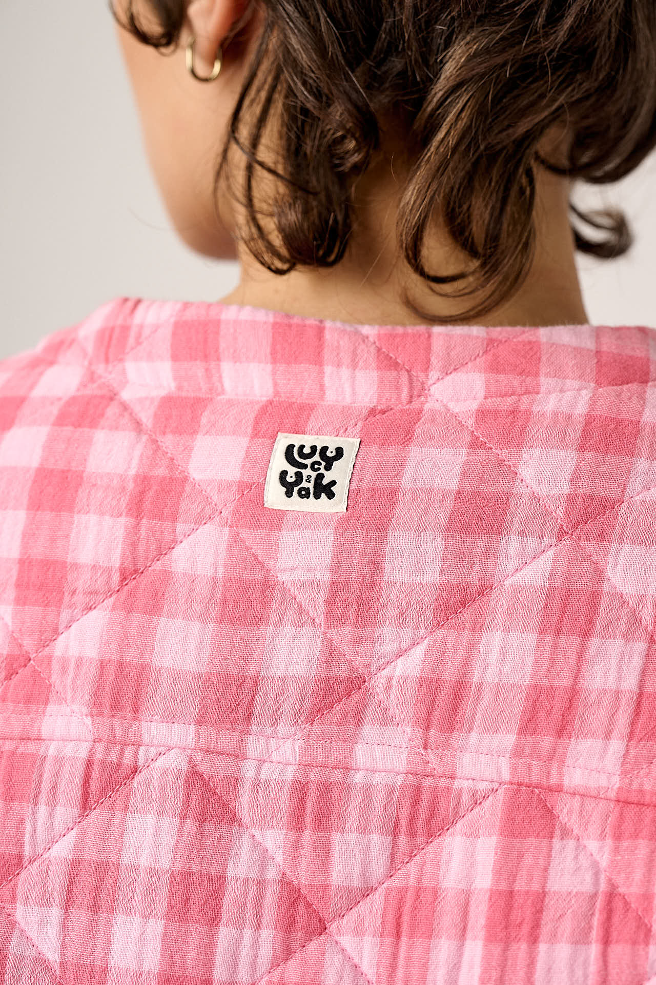 Cleo - Cotton Collarless Quilted Jacket in Pink Check