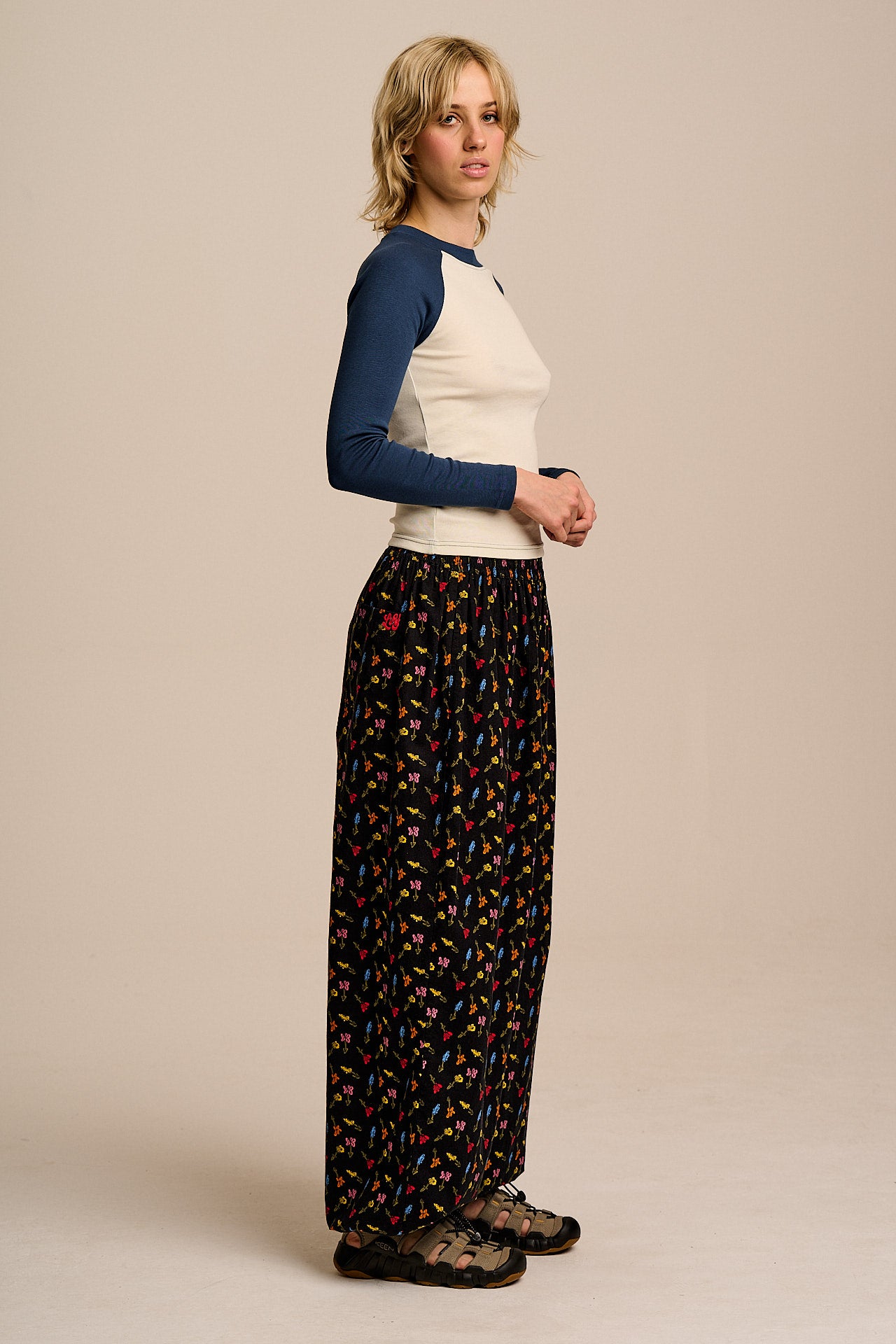 Renata - Cuffed Cotton Balloon Leg Trousers in Mini Tulips on Black