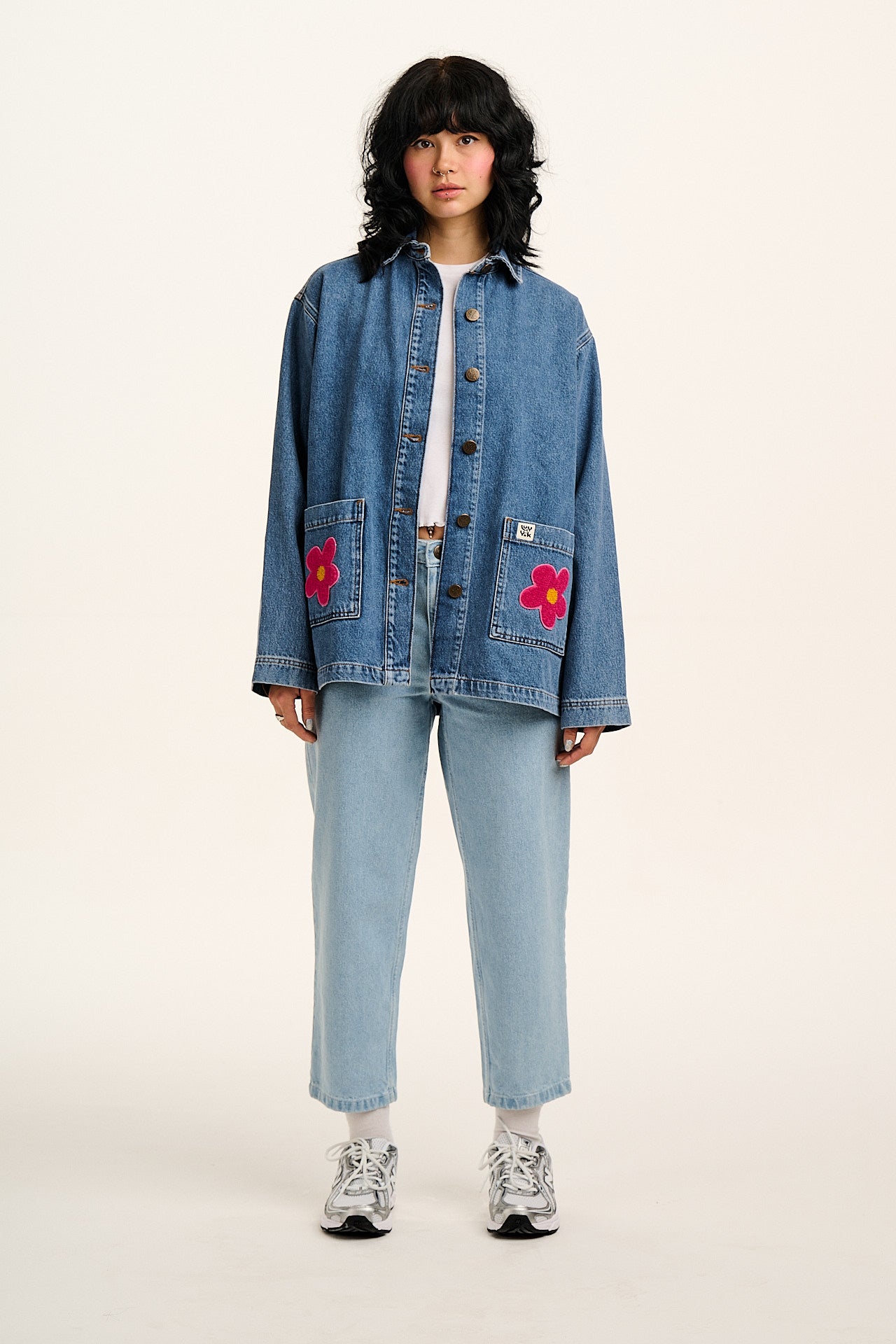 Olly - Denim Jacket in Mid Wash Blue with Pink Flower Motif