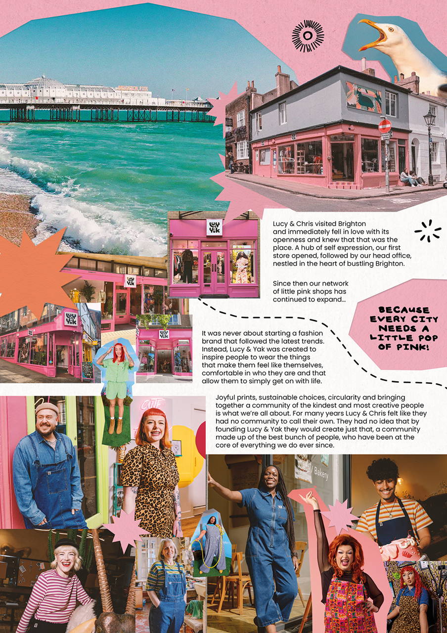 They travelled all over India in search of the perfect partners to create the first dungaree, the Original.  Working with a small team of tailors, they made their first thirty pairs which sold in hours. They made one hundred more and the same thing happened and the rest, as they say, is history.   Yak was soon too small to operate as a home, warehouse and office so they upgraded to the basement of Lucy’s parents house in Barnsley. With all the family on board, packages were on their way to the very first Lucy & Yak customers. Packaged on the kitchen table, a coaster or two might have accidentally made their way into them!  While we no longer fit in the basement and have moved to new distribution locations, we’ve never strayed far. After all, Barnsley is home!    Starting as an online brand, we soon wanted a physical space where we could connect with all of our customers. But where to open our very first little pink shop?   Lucy & Chris visited Brighton and immediately fell in love with its openness and knew that that was the place. A hub of self expression, our first store opened, followed by our head office, nestled in the heart of bustling Brighton.   Since then our network of little pink shops has continued to expand…because every city needs a little pop of pink!