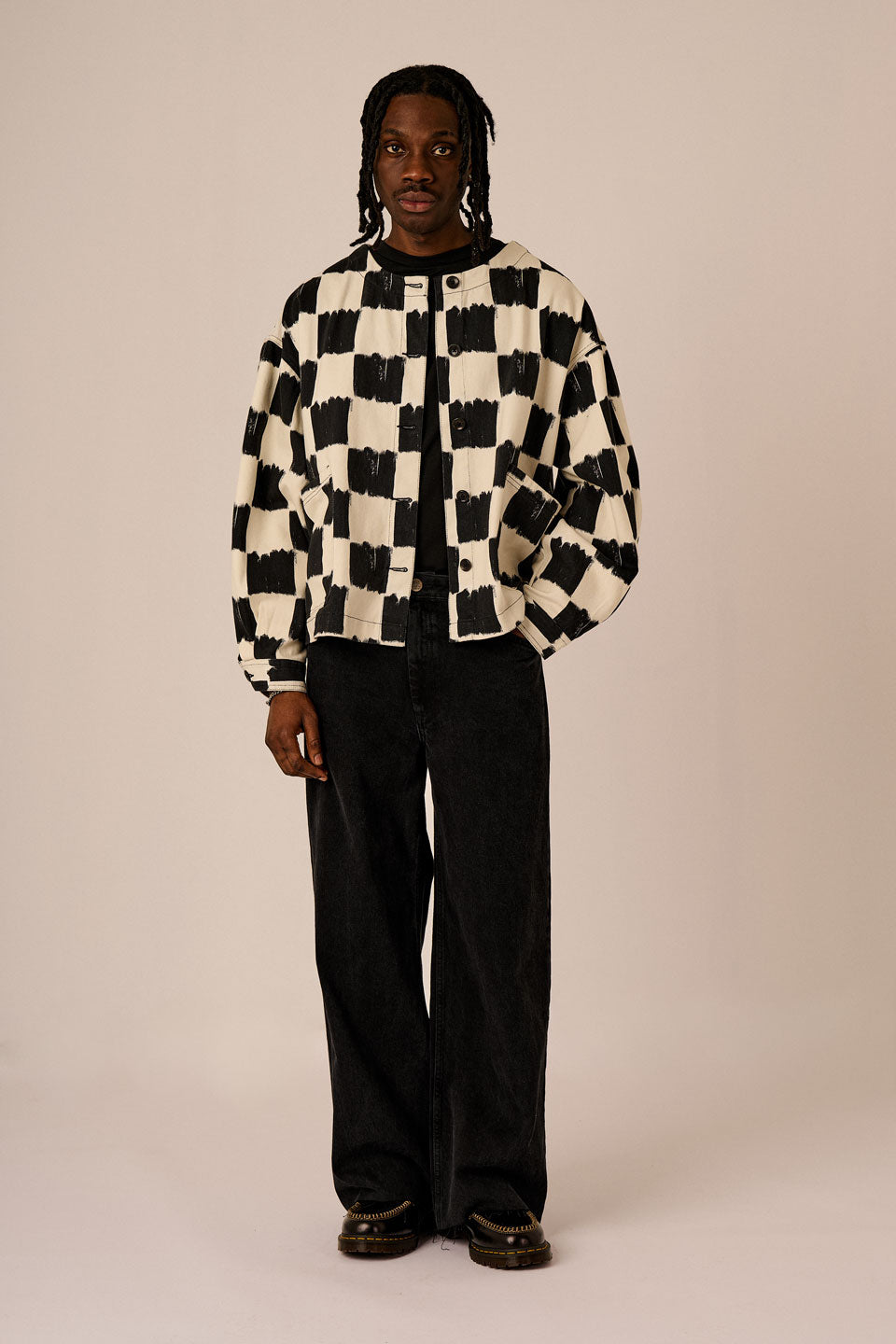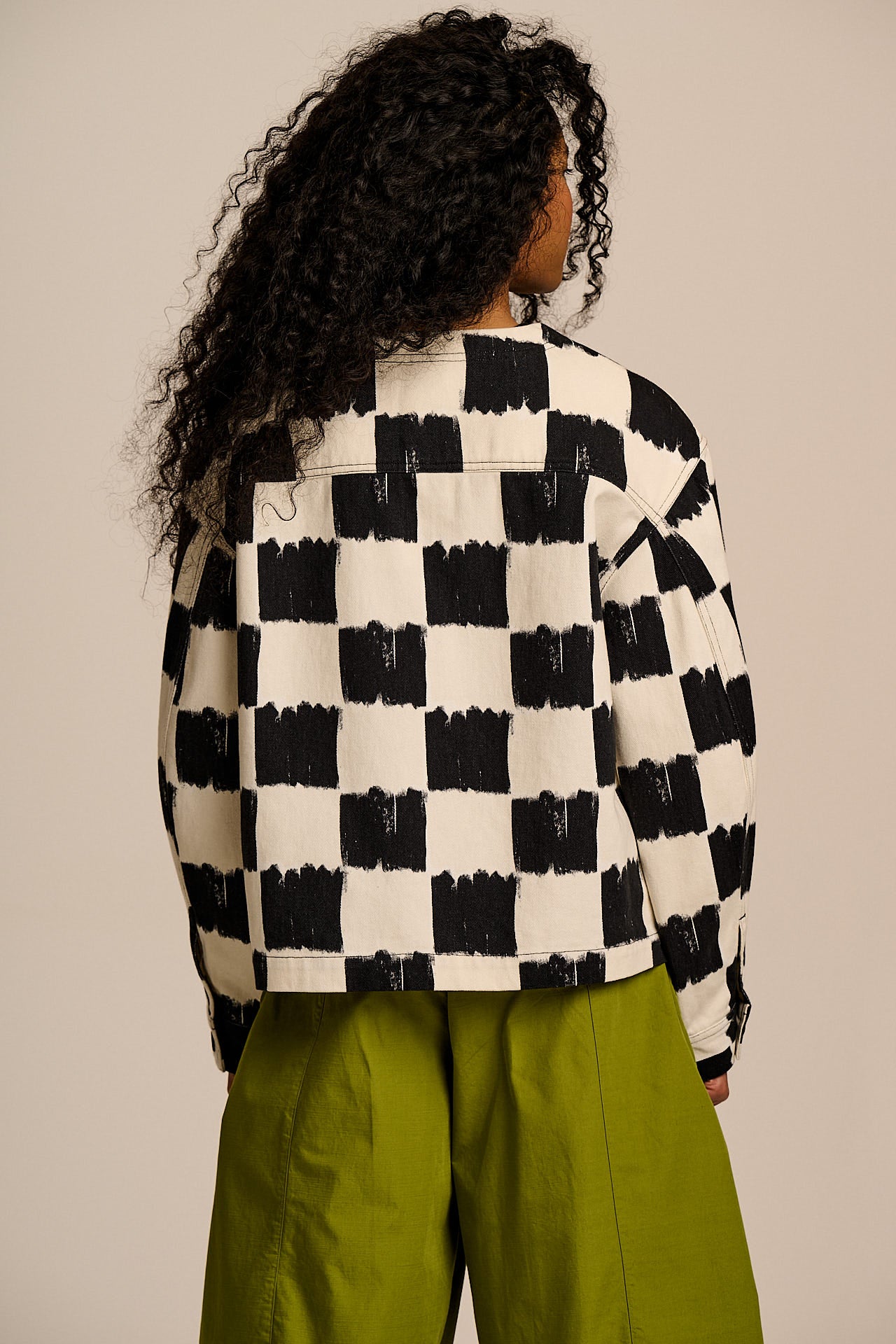 Amarante - Collarless Cotton Jacket in Black & Ecru Blurred Checkerboard